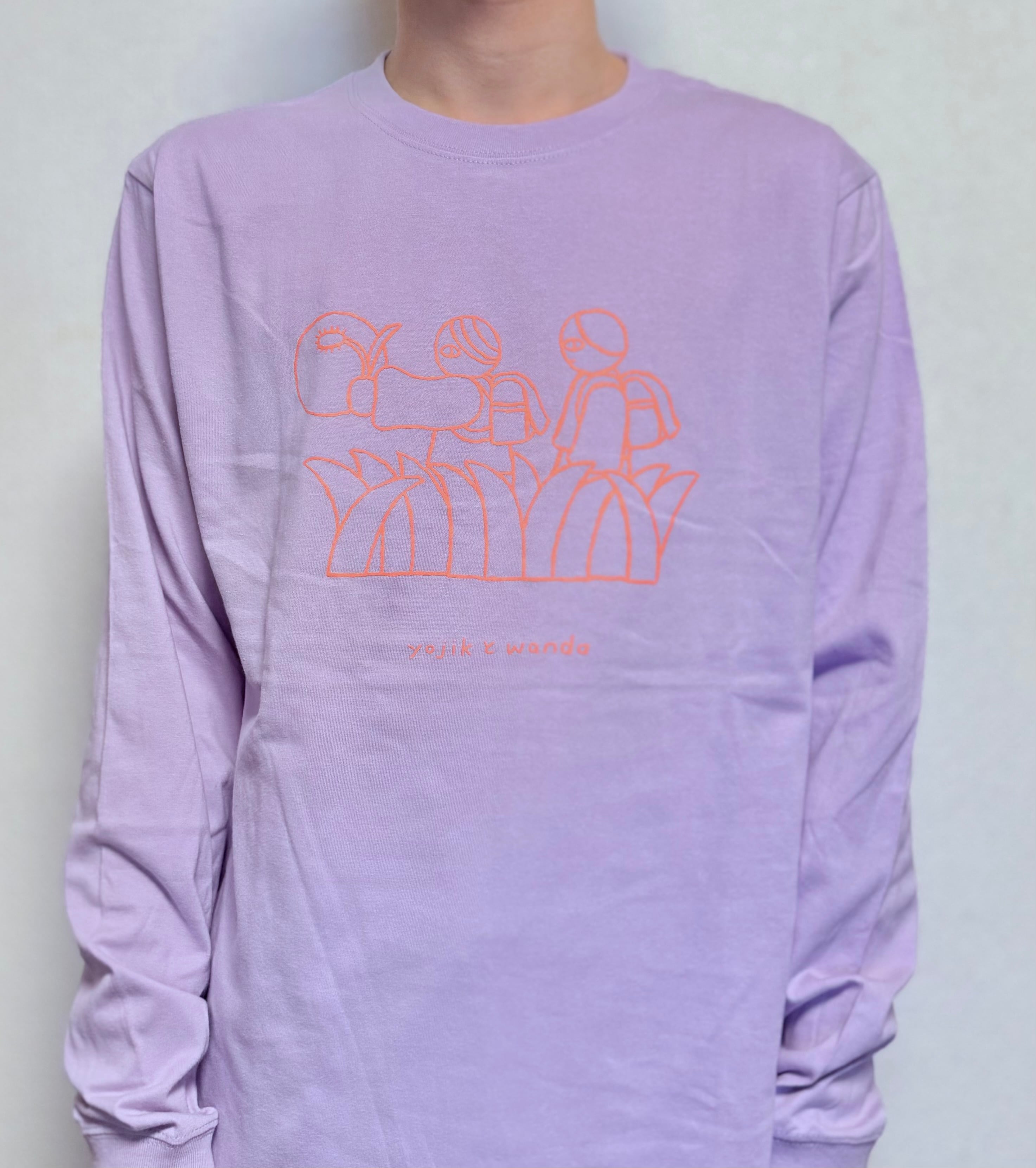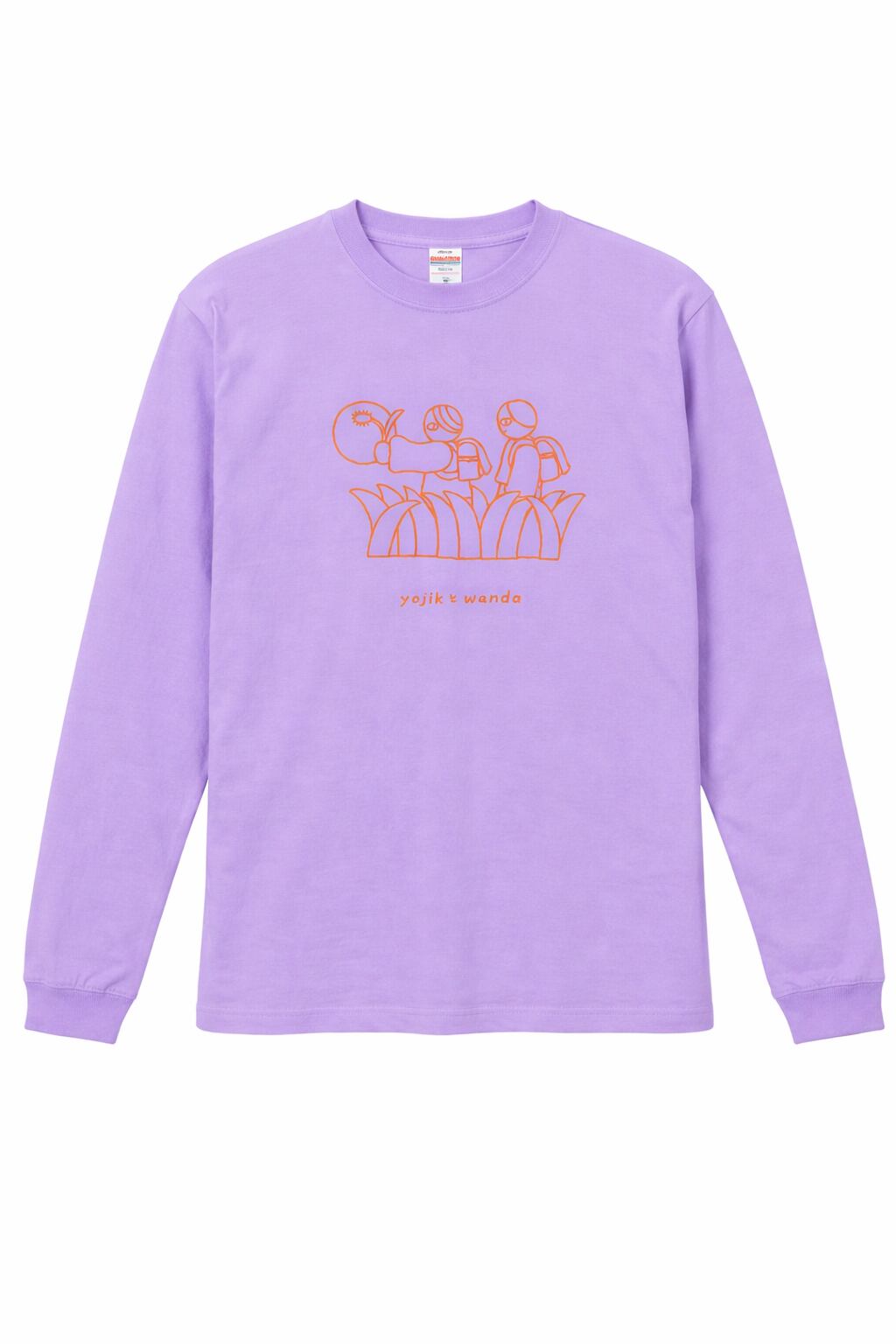 ライトパープルの生地に、蛍光オレンジのインクでイラストが入っています。