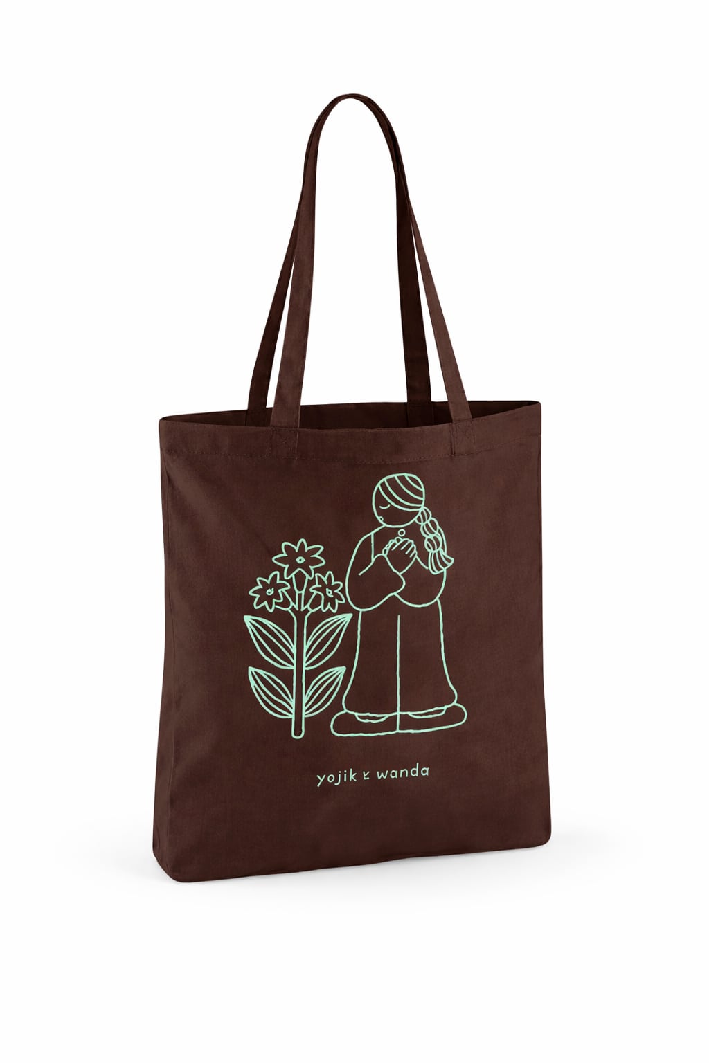 チョコレートブラウンの生地にパステルグリーンのインクでイラストが入っています。